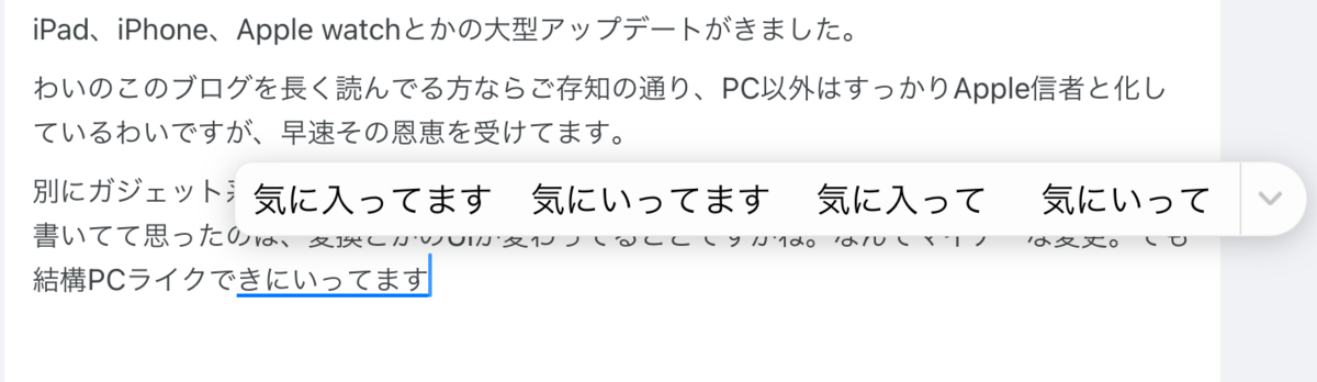 別にガジェット系ブログではないので、そんな事細かに書かないですけど、今こうしてブログ書いてて思ったのは、変換とかのUIが変わってることですかね。なんてマイナーな変更。でも結構PCライクで気に入ってます。